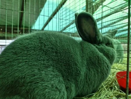Zfr Heinz Lemke errang mit der Rasse Satin, hasenfarbig mit 385,0 Punkten einen E1 Preis